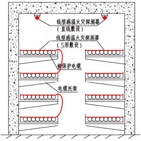 隧道內(nèi)應(yīng)沿電纜設(shè)置線型感溫火災(zāi)探測(cè)器,且在電纜接頭端子等發(fā)熱部位應(yīng)保證有效度;隧道內(nèi)設(shè)置的線型感溫火災(zāi)探測(cè)器可接入電氣火災(zāi)監(jiān)控系統(tǒng)。無外部火源進(jìn)入的電纜隧道應(yīng)在電纜層上表面設(shè)置線型感溫火災(zāi)探測(cè)器;有源入可能的電纜隧道在電纜層上表面和隧道頂部,均應(yīng)設(shè)置線型感溫火災(zāi)探測(cè)器。線型感溫火災(zāi)探測(cè)器采用“S”形布置或有外部火源進(jìn)入可能的電纜隧道內(nèi),能響應(yīng)火焰規(guī)模不大于100mm 的線型感溫火災(zāi)探測(cè)器。如圖3所示:
