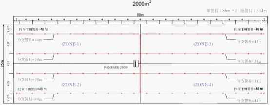 下圖是防火分區(qū)2000m2,使用FANFARE-2000探測主機,分為4個探測區(qū)域(每區(qū)500m2),采樣孔保護面積25.2m2的管路設(shè)計圖